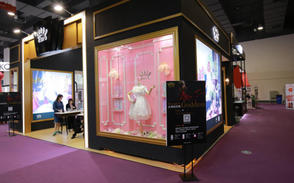 法式考究的展台布置、粉色少女系的摆设,公主风的橱窗和黑黄色的背景,让这个在充斥着情欲味道的展会里显得如此清新和惊艳。
